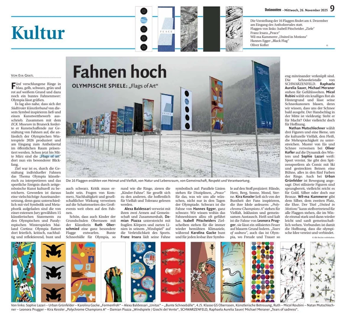 Fifteen flags by artists from South Tyrol, Veneto, and Lombardy fly at the entrance to the Antholz Valley - where the Olympic Biathlon competitions take place - from December 2025 till March 2026.