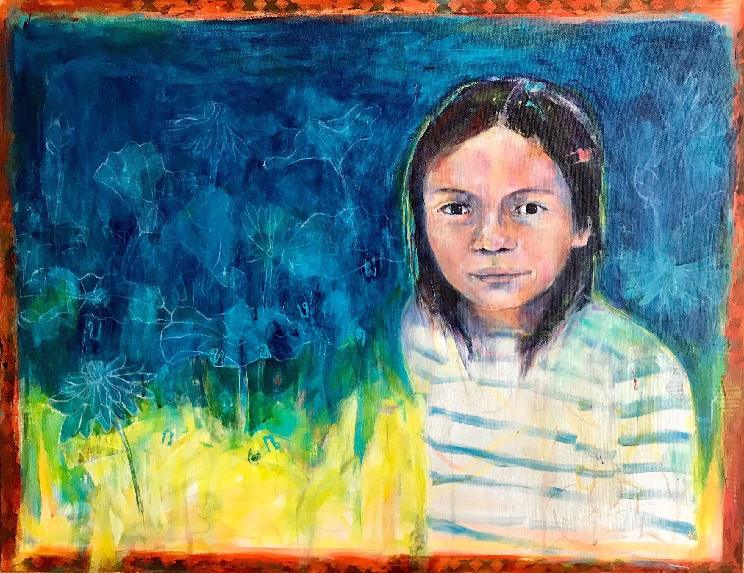 The painting I am putting up for auction, is called “Playing in the Lotus Pond.” It is a colourful acrylic and collage piece, inspired by Thailand, with a young girl in the foreground, and lotus flowers and Thai letters making up the background. The lotus flower is often a symbol of purity, enlightenment and rebirth, and is a perfect analogy for the human condition- even when its roots are in dirty water, the lotus produces the most beautiful flower.